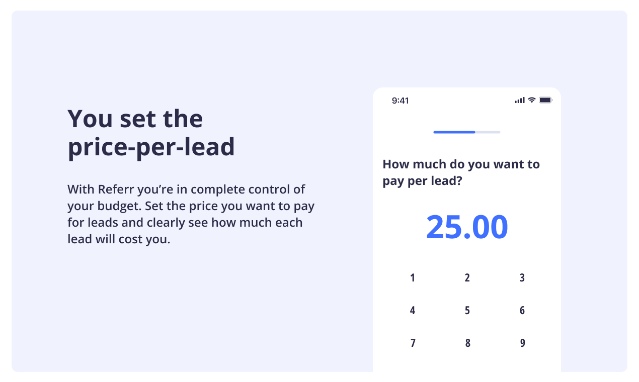 - Transparent Pricing: On Referr, buyers set the price they want to pay for leads. They're not forced to accept a price set by the seller or the platform. This transparent pricing model gives buyers control over their lead generation budget and ensures they get fair value for their money.